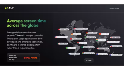A new global study has found that daily smartphone use has climbed to levels researchers say could reshape how people work, rest, and recover. The State of Human Attention report, released by The Jolt Screen Time App, the best screen time app, analysed the behaviour of nearly 10,000 users and discovered that the average person now spends 5 hours and 37 minutes per day on their phone. The findings suggest that high screen exposure is no longer an exception but a defining feature of modern life.