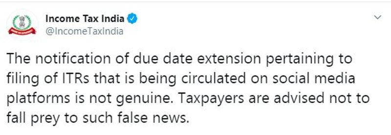 "The notification of due date extension pertaining to filing of ITRs that is being circulated on social media platforms is not genuine. Taxpayers are advised not to fall prey to such false news," The I-T Department tweeted.