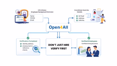 Open4All operates as a fully digital, consent-based background verification platform designed specifically for the Indian hiring ecosystem. HR professionals, founders, and company owners can register their organizations on the platform at www.open4all.in and begin verifying employees within minutes without dealing with agents or paperwork. The process is designed to be simple and efficient. First, the company registers on the platform. Next, the employer adds the employee’s name, email address, and mobile number. The employee then provides digital consent for the verification. Once consent is granted, Open4All checks relevant government databases instantly. Within minutes, the company receives a clear and transparent verification report.