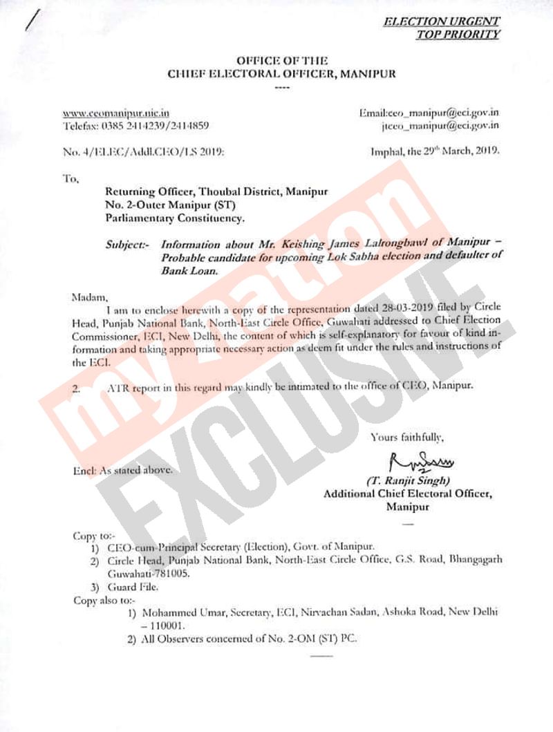 The letter further stated, "We have come to know that Keishing James Lalrongbawl (director of North East Region Fin Services Ltd and also a personal guarantor in the loan account), PAN no – AGCPJ0272F, DIN -00386167, is going to contest in the upcoming Lok Sabha elections from Outer Manipur seat from Indian National Congress and has thus decisively resigned from the Directorship of the company in order to suppress the fact of availing loan."