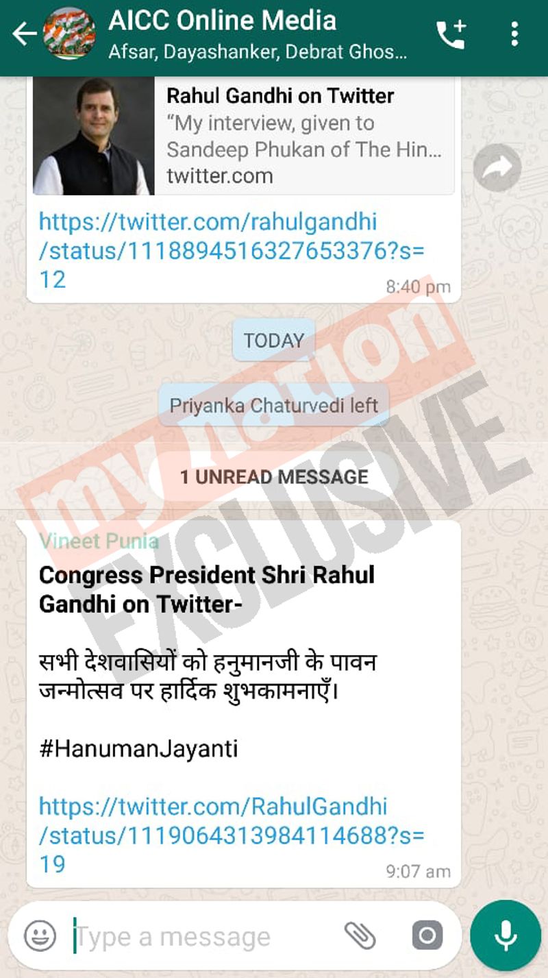 A purported screenshot of a WhatsApp group going by the name of ‘AICC Online Media’ is doing the rounds, and it clearly shows “Chaturvedi ‘left’ the group”.