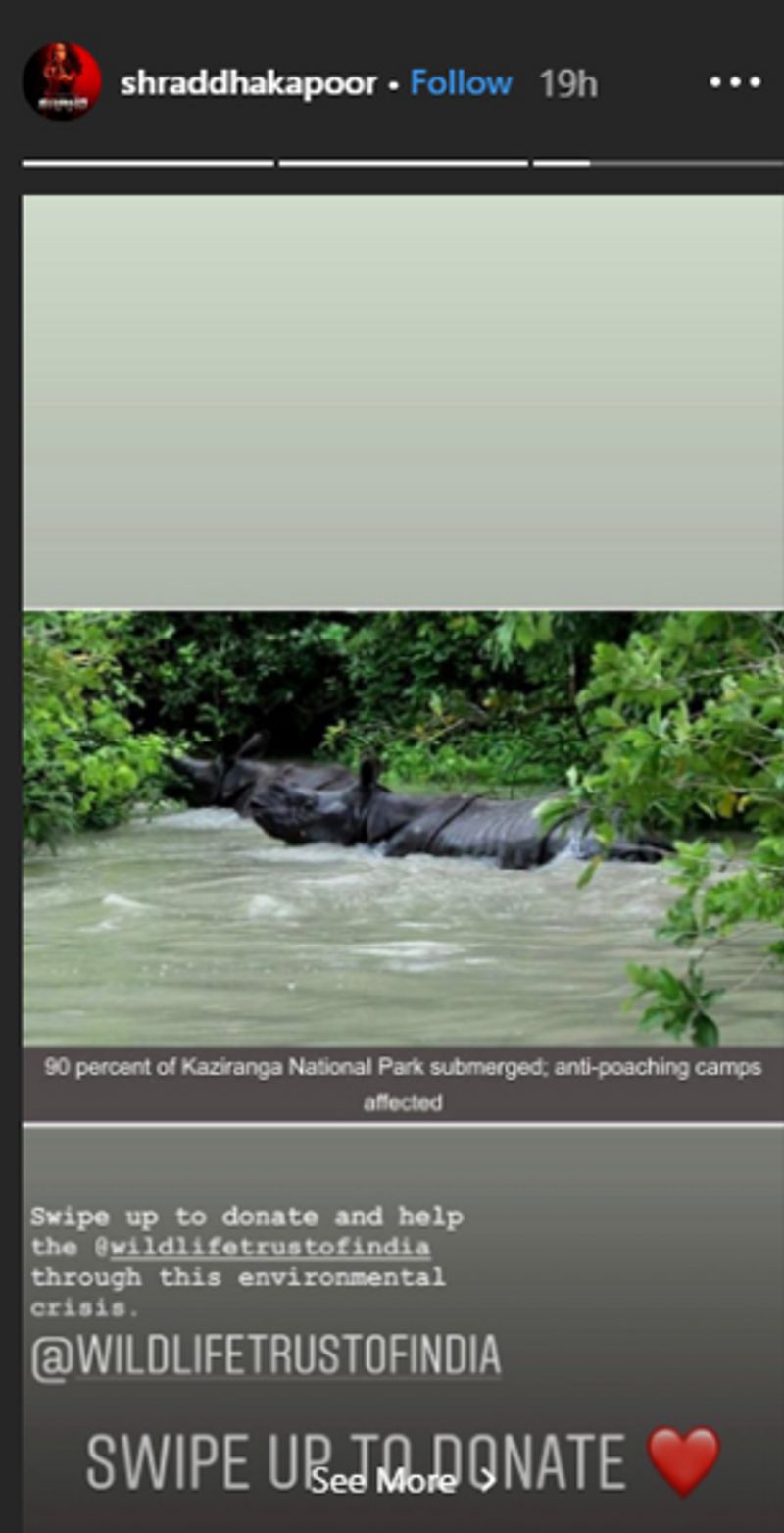 Actress Shraddha Kapoor posted an Instagram story on how 90% of Kaziranga National is submerged. She asked her followers to donate to Wildlife Trust of India.