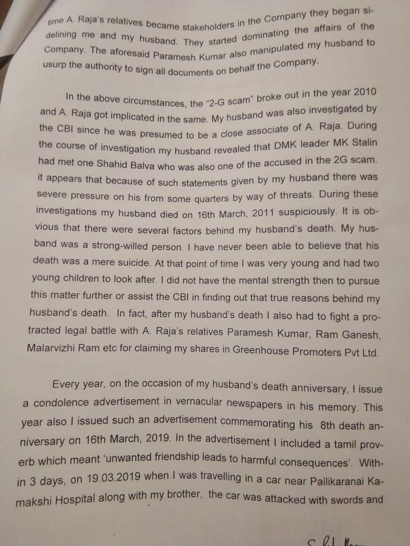 "More specifically, they should reinvestigate the statements given by my husband during the course of the investigation and identify who all he spoke about, including MK Stalin and A Raja," she demanded.