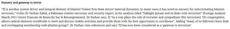 In this, he quotes Dr Farhan Zahid, a Pakistani counter-terrorism and security expert as saying, “TJ is another system driver and integral element of Islamist Violent Non-State Actors’ internal dynamics; in many cases it has acted as nursery for indoctrinating Islamist terrorists.”
