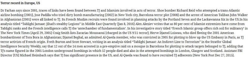 Under another header “Terror record in Europe, US” the journalist exposes, with the hep of Dr Farhan, how “traces of links have been found between TJ and Islamists involved in acts of terror. Shoe bomber Richard Reid who attempted a trans-Atlantic airline bombing [2001], Jose Padilla who tried dirty bomb manufacturing [2002] in New York city, Barcelona terror plot [2008] and the arrest of American Taliban John Walker in Afghanistan [2001] were all linked to TJ.”