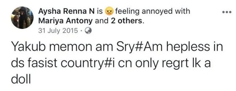 Aysha Renna had labelled India a ‘fascist’ regime as Yakub Memon was hanged to death, after a fair trial in Indian courts, in which he was found to have played a pivotal role in Mumbai blasts that killed hundreds of people.