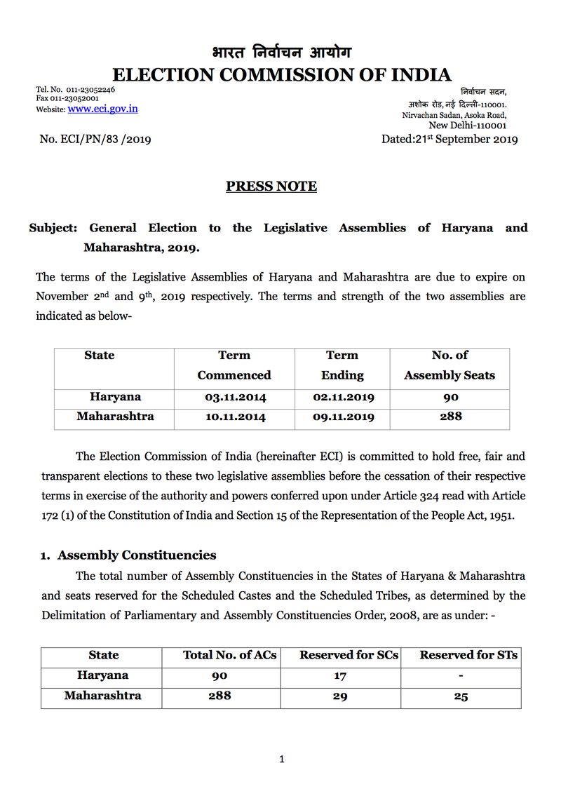 New Delhi: The Election Commission of India (ECI) on Saturday (September 21) announced the dates for Maharashtra and Haryana Assembly elections. The two states would go to polls on October 21.