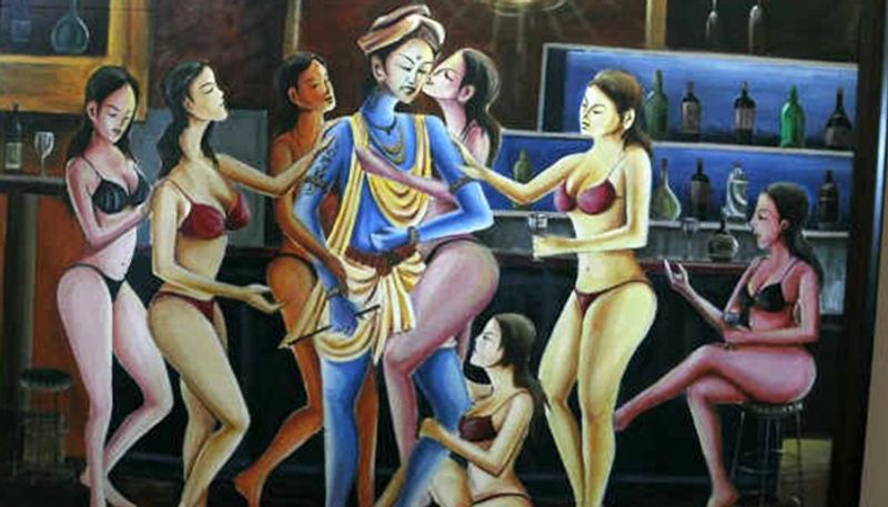 Bengaluru: Just last week, a Muslim mob in Bengaluru burnt down the house of a Congress MLA Akhanda Srinivas Murthy and set fire to a police station and attacked policemen on duty and torched more than 20 vehicles, as they took offence to a post making fun of Prophet Muhamad. Now here’s another picture which has resurfaced on the internet. The picture is grotesque in the sense that a Muslim artist Akram Hussain from Assam has depicted Lord Krishna, whom millions revere as an avatar of Lord Vishnu, among bikini-clad women!