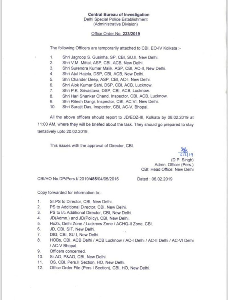 According to a letter issued by the CBI, 10 officers have been transferred to Kolkata and will be based in the city till February 20. The letter also says that these officers will be briefed about the task after reaching Kolkata. From there, they will head to Shillong to interrogate Kumar.
