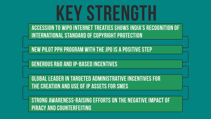 India's accession to the WIPO Internet Treaties, the agreement to initiate a patent prosecution highway with international patent offices, a dedicated set of IP incentives for small businesses, and administrative reforms to address the patent backlog are the specific reforms for India's improvement, according to Kilbride. “All of these enhance India’s competitiveness in research & development-intensive industries,” he added.