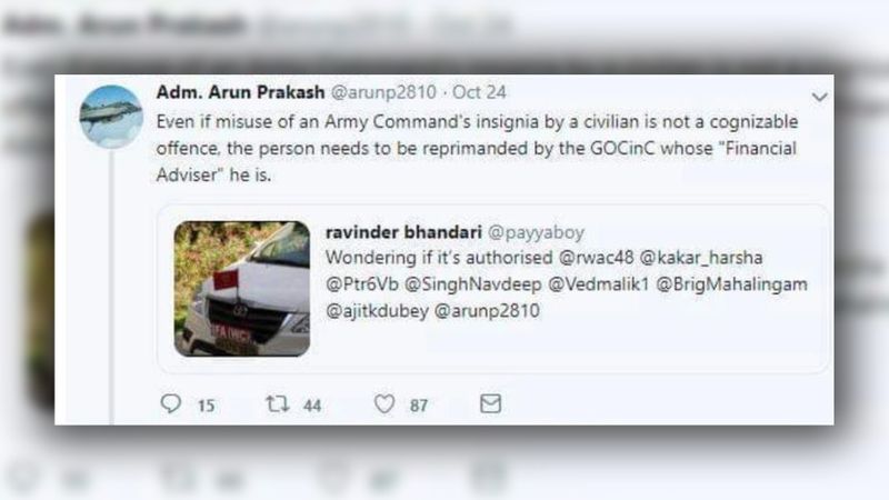The issue started when Admiral Prakash tweeted on Wednesday over the misuse of flags and insignia by the defence services officers, saying “Even if misuse of an Army Command’s insignia by a civilian is not a cognizable offence, the person needs to be reprimanded by the GOCinC whose ‘Financial Adviser’ he is.”