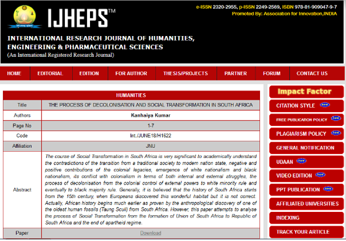 Kumar recently submitted his thesis in JNU, which he had completed under the guidance of Left-leaning professor SN Malakar in the Centre for African Studies, School of International Studies (SIS). Titled ‘The Process of Decolonisation and Social Transformation in South Africa’, the article was published in June this year in IJHEPS.