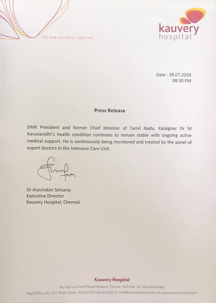 The Kauvery Hospital has released two statements with about the health condition of DMK Chief M Karunanidhi.