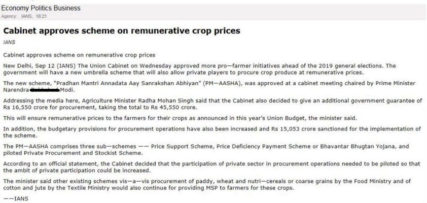 The sentence read: “The new scheme, Pradhan Mantri Annadata Aay Sanrakshan Abhiyan (PM-AASHA), was approved at a cabinet meeting chaired by Prime Minister Narendra B****** Modi.”