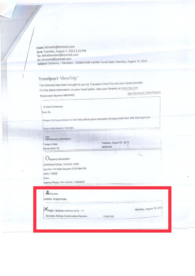 Patra gave details of Vadra’s travels to Zurich as well: “Bhandari sent two tickets to Vadra from the email deltabhandari@hotmail.com. He sent two tickets in the same month, August. Each ticket cost him Rs 8 lakh. I don’t know how can a ticket cost so much. It’s said it’s a bassinet ticket. I have no idea what a bassinet is. Only the rich know. The first mail is sent on August 7, 2012, and he travels on August 13, 2012, on flight EK-71 with confirmation number EMTVB.” The second flight was booked on Swiss flight LX-563 to Zurich, the financial capital of Switzerland.