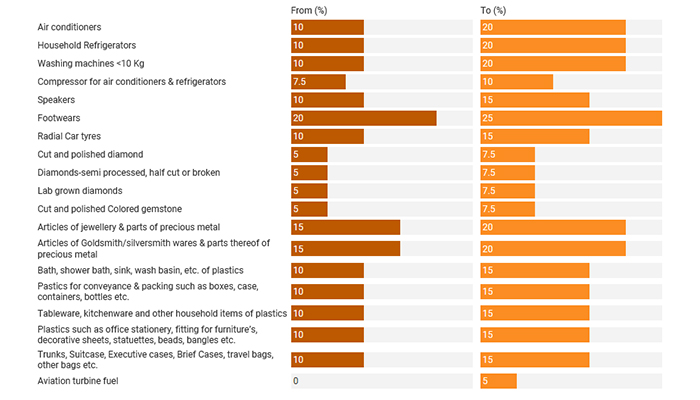 Import duty on air conditioners, refrigerators and washing machines under 10-kilogram capacity has been doubled to 20% each from 10% earlier. The basic customs duty on radial tyres has been raised to 15% from 10% earlier, while the levy has been hiked to 25% from 10% on footwear. The government also introduced an import levy of 5% on the aviation turbine fuel.
