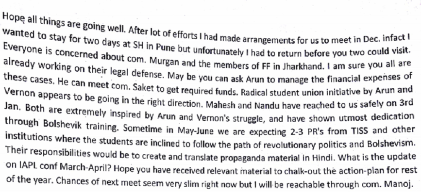 In this paragraph of the alleged letter by Bharadwaj, Gautam Navlakha, who another urban naxal arrested by Pune Police on August 28, is named. According to the letter, Navlakha was in touch with those fighting the Indian state in Kashmir.