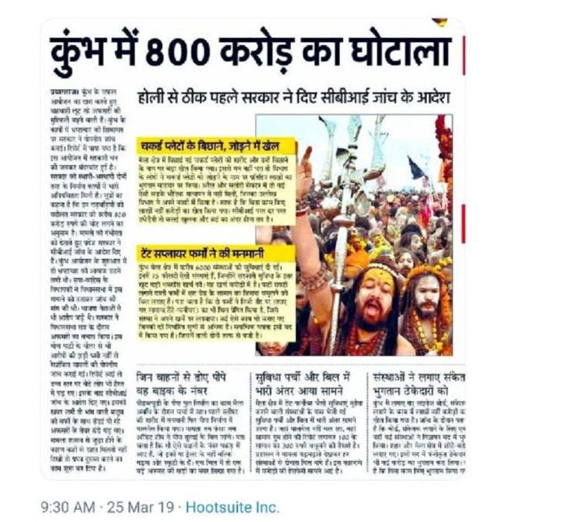 New Delhi: An exchange of allegations between political rivals is commonplace during an election season. But the Congress does not stop at that; it takes recourse to fake news to make its point against its archrival BJP. On the occasion of Holi, a newspaper published the satirical piece that claimed the organisation of this Kumbh Mela was scam-tainted. The Congress Twitter handle shared the link and demanded a probe into the ‘scandal’.