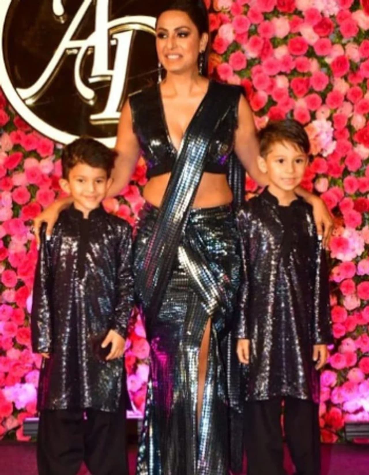 Kashmera Shah brought the glamour to the night with her stunning black saree and high ponytail. Here she is posing with her two sons, who look adorable in matching outfits.