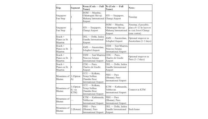 - Sometimes people go to India → USA (like JFK/Miami) → SXM.