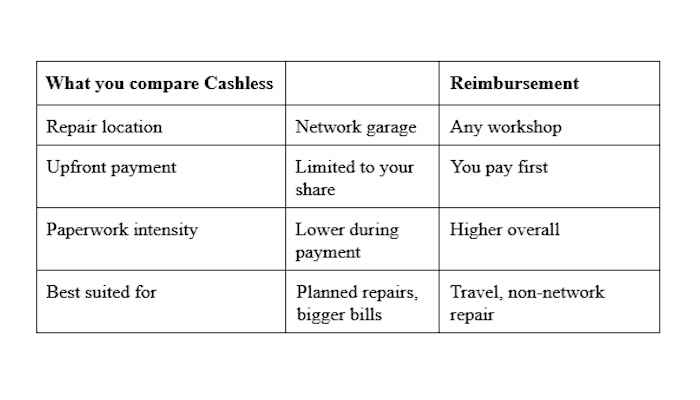 In reimbursement, you pay the workshop first and then claim the eligible amount from the insurer. This is useful when you repair at a non-network garage, during travel, or when you need immediate work done.