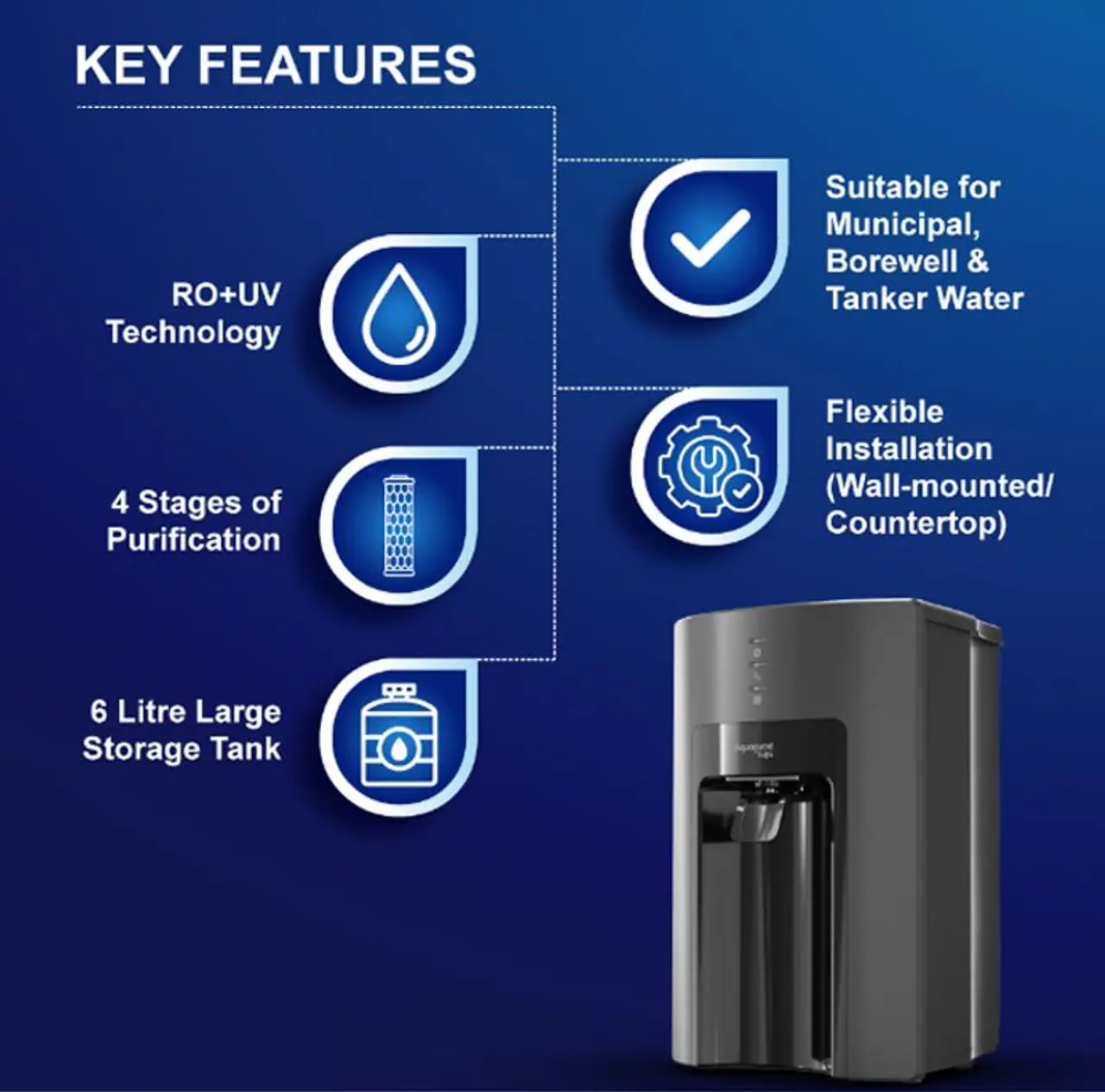 - Multi-Stage Purification: Employs an amalgamation of UV, RO, UF and MTDS techniques to guarantee complete water purification.