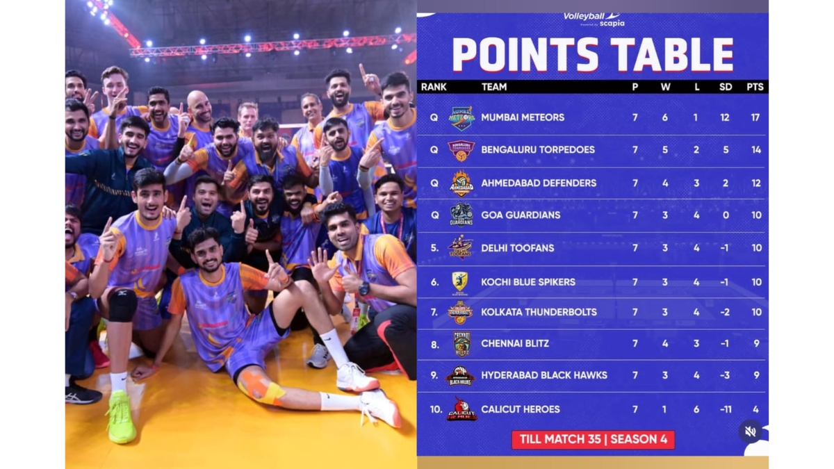 Mumbai Meteors defeated Bengaluru Torpedoes 15-13, 15-13, 18-20, 15-10 to top the PVL 2025 points table; Shubham Chaudhary named Player of the Match.