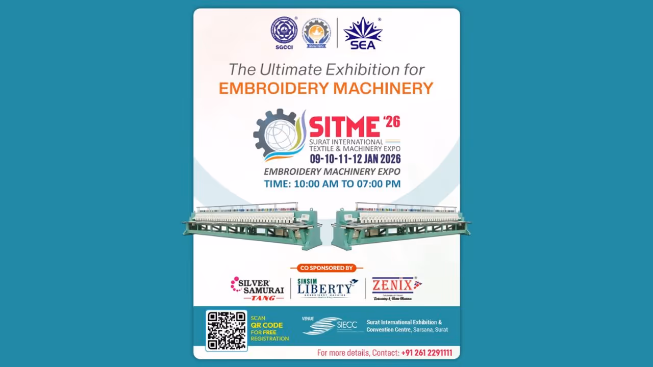SGCCI and SEA present SITME 2026 – Surat International Textile & Machinery Expo Jan 9-12 at SIECC, showcasing 100+ embroidery machines for 25,000+ visitors.