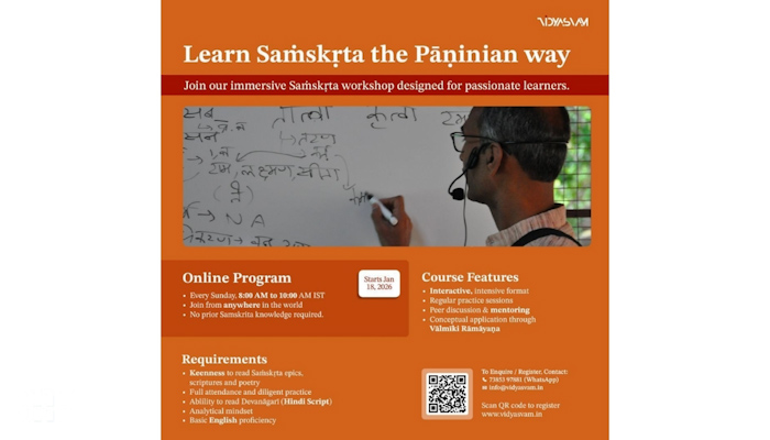 Vidyasvam, an educational platform dedicated to traditional knowledge systems, has announced the launch of its new online Samskṛta workshop, designed for learners seeking a structured and concept-driven introduction to the language. The program begins on January 18, 2026, and will be conducted every Sunday from 8:00 AM to 10:00 AM IST, enabling participants from across the world to join.