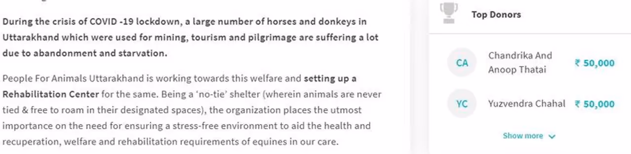 On the donation page, it is written, “During the crisis of COVID -19 lockdown, a large number of horses and donkeys in Uttarakhand which were used for mining, tourism and pilgrimage are suffering a lot due to abandonment and starvation.