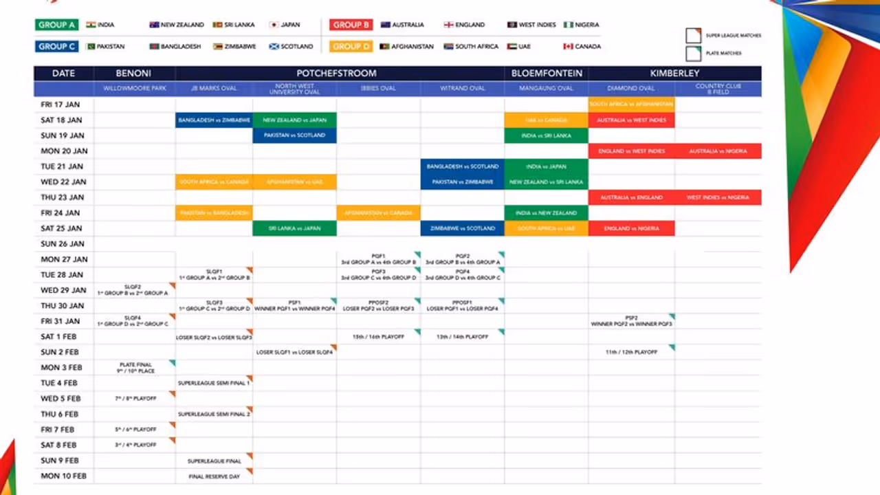 Defending champions India play Sri Lanka at the Mangaung Oval in Bloemfontein on January 19. Nigeria, who are also making their ICC event debut will face Australia in Kimberley on January 20 for their opening game.