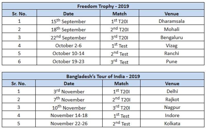 The 2019-20 season will start with the Freedom Trophy for the Gandhi-Mandela series played between India and South Africa in September, followed by a T20I and Test series against Bangladesh in November