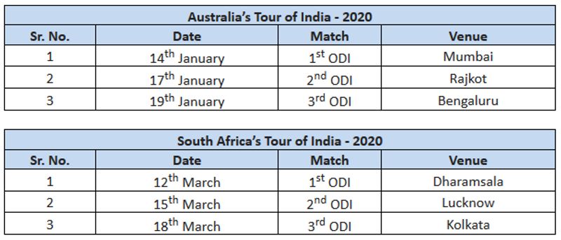 South Africa: Three T20Is in Dharamsala, Mohali and Bengaluru; three Tests in Visakhapatnam, Ranchi and Pune; three ODIs (in March 2020) in Dharamsala, Lucknow and Kolkata