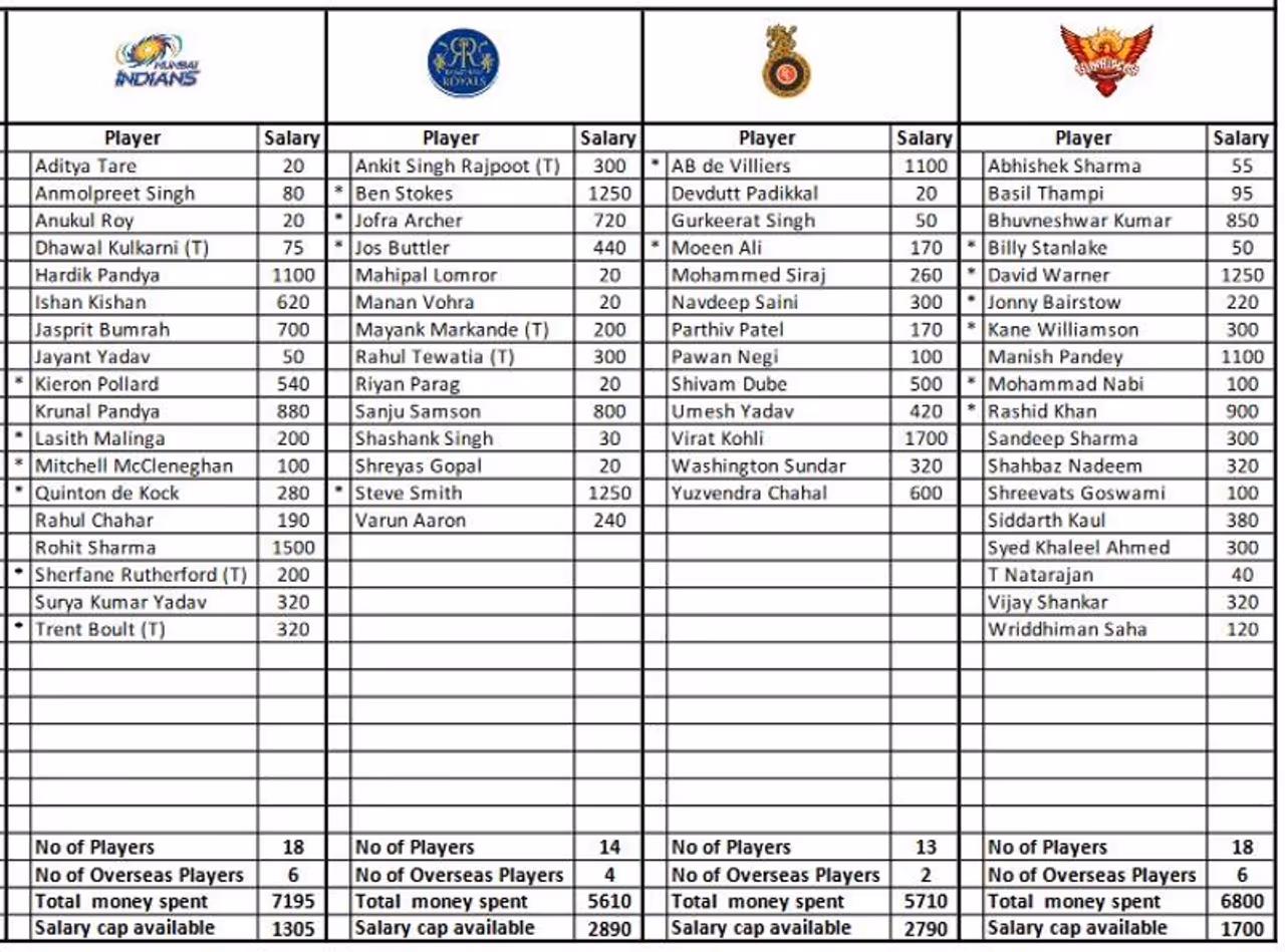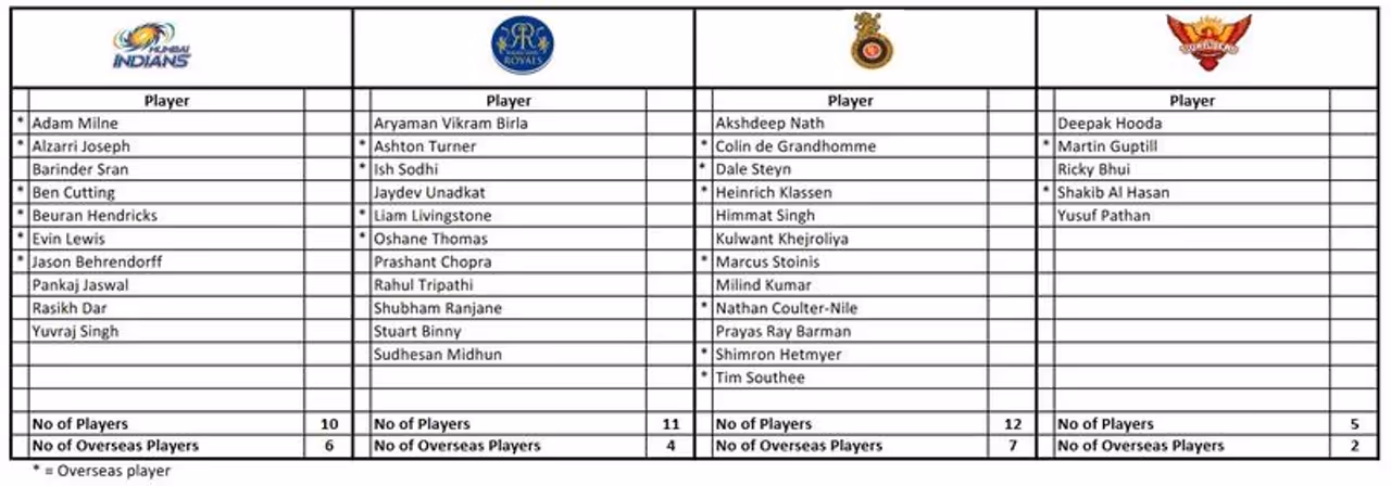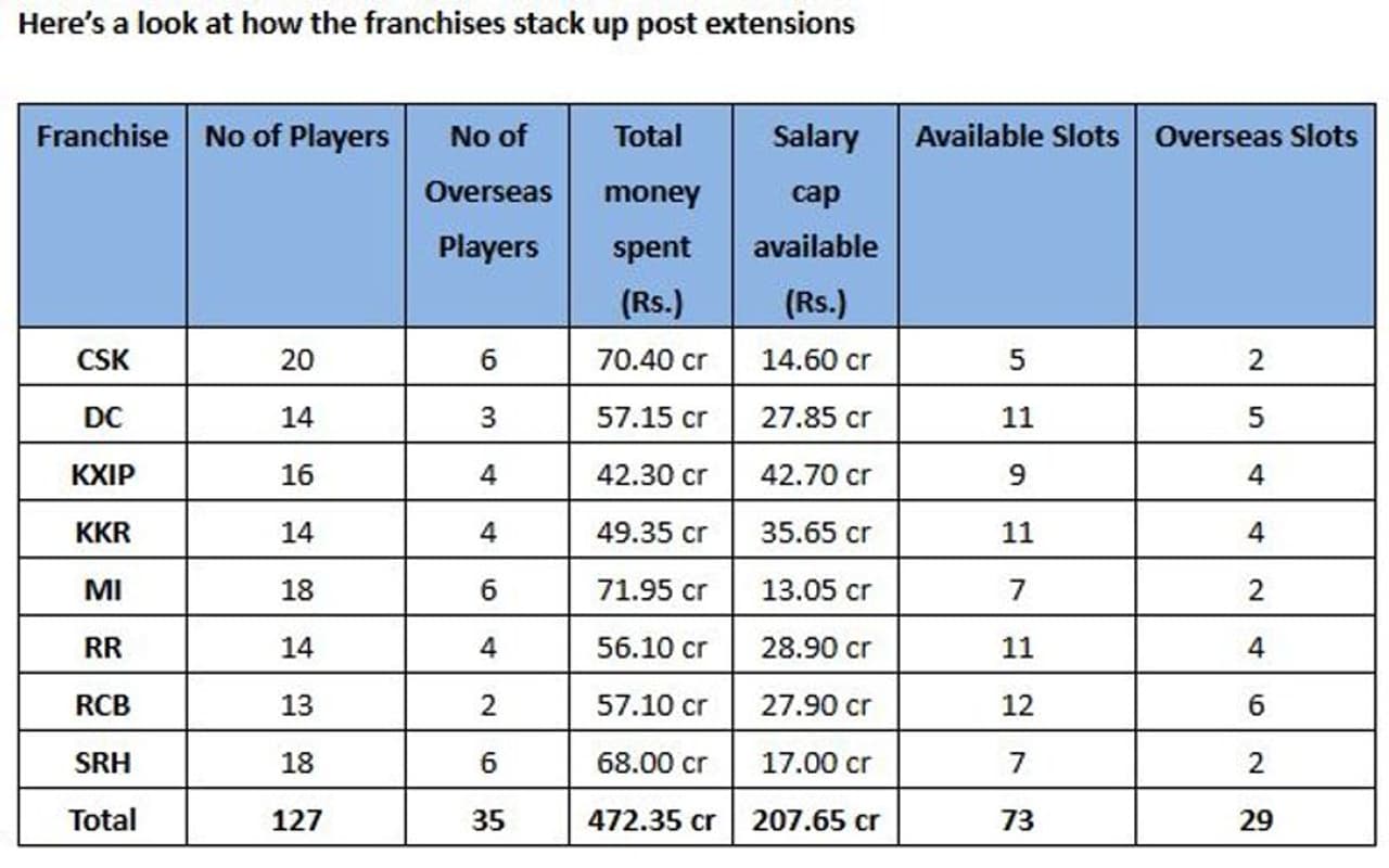 Kings XI Punjab (Rs 42.70 crore) now have the highest salary cap available going into the auction while Royal Challengers Bangalore (12) have the most number of player slots available (including 6 overseas slots). After today’s deadline, Chennai Super Kings (20) have the largest squad size.