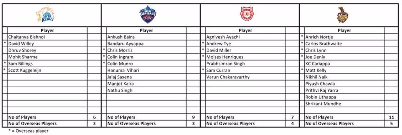 Kings XI Punjab (Rs 42.70 crore) now have the highest salary cap available going into the IPL 2020 auction while Royal Challengers Bangalore (12) have the most number of player slots available (including 6 overseas slots). After the deadline, Chennai Super Kings (20) have the largest squad size