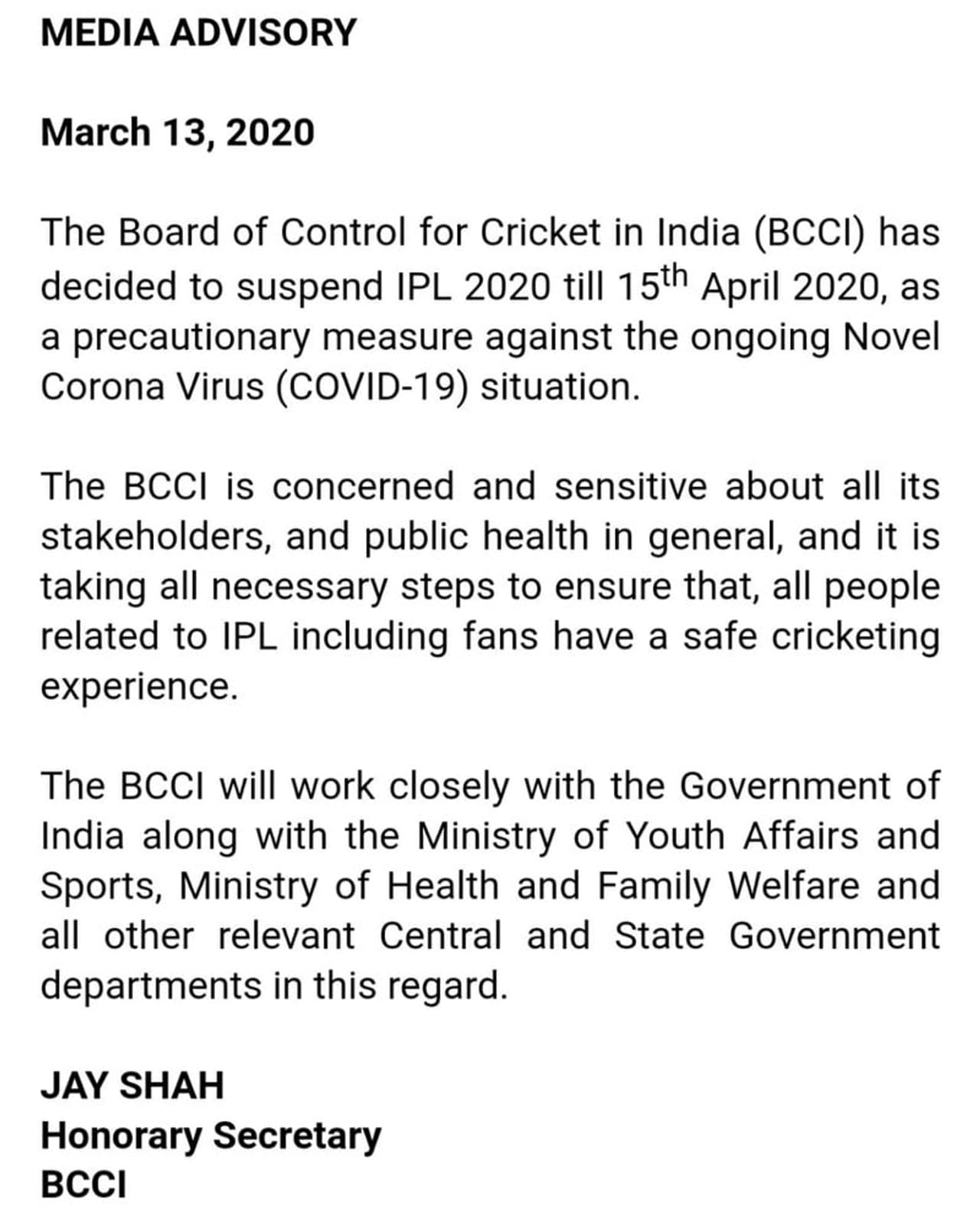 'The Board of Control for Cricket in India (BCCI) has decided to suspend IPL 2020 till 15th April 2020, as a precautionary measure against the ongoing Novel Corona Virus (COVID-19) situation,' BCCI secretary Jay Shah said
