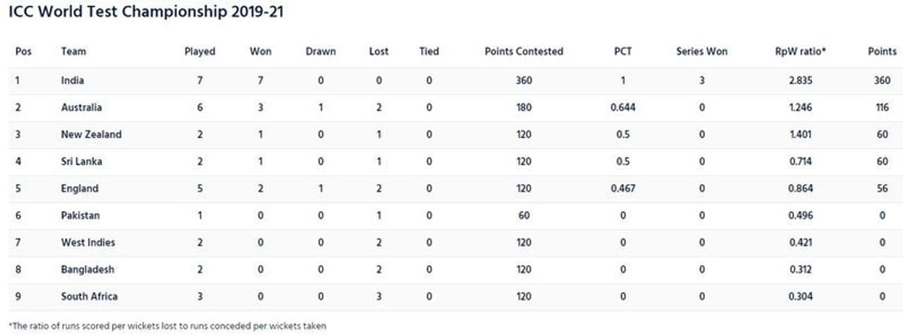 India also extended their winning streak in the ICC World Test Championship to seven (two vs West Indies, three vs South Africa, two vs Bangladesh). They have 360 points from seven games and sit comfortably on top of the table.