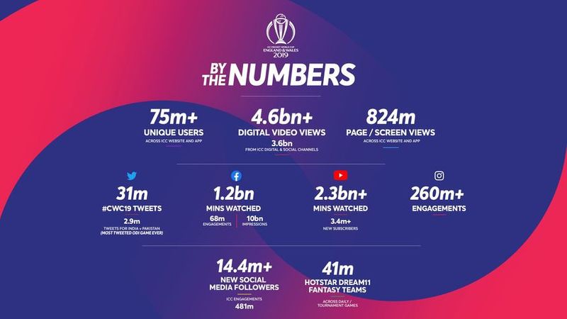 The event also saw record numbers on Twitter and Instagram with a number of videos reaching more than 3 million views. The official ICC YouTube channel saw 2.3 billion minutes of tournament content viewed. On Facebook, there were over 1.2 billion minutes of content watched, over 10 billion impressions and over 68 million engagements.