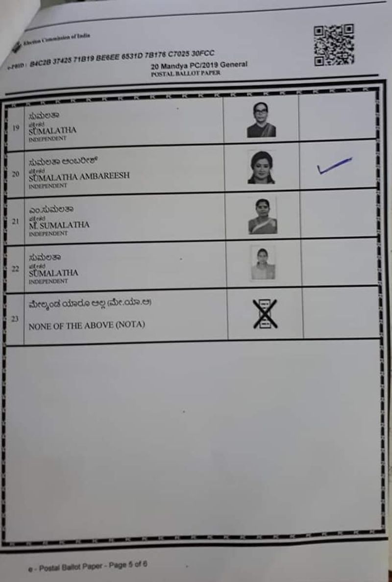 Raja Nayak, a CRPF man had posted the photo of the ballot paper which showed that he voted for Sumalatha Ambareesh with a message stating: "I am celebrating Ugadi by posting my first vote for Sumalatha Ma'am and wishing her a win with a huge lead. My request to the people of Mandya is that our region should develop. Many farmers have committed suicide in Mandya. This should stop. Even soldiers should be benefitted. Ambareesh has contributed a lot to Mandya. Keeping that in mind vote for Sumalatha and help her win the election. Show some self respect."