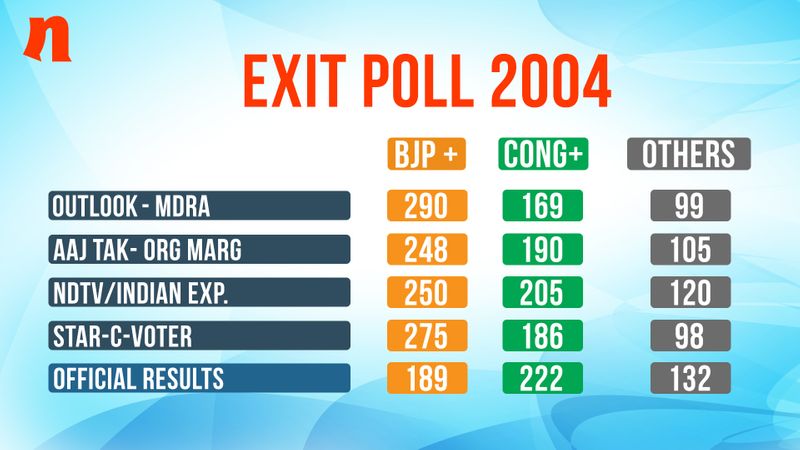 2004 was when everyone predicted an NDA sweep but it was the UPA 1 with a plethora of allies including the Left front that led its support from outside. While the Congress and its allies got 222 seats in 2004, none of the pollsters predicted anywhere above 200 save one NDTV and Indian Express survey who gave the Congress-plus 205 seats that year. Similarly, the NDA got 189 seats but all surveys gave it above 200 seats in 2004. In fact, Outlook-MDRA gave 290 seats to the NDA. Others like Aaj Tak-ORG Marg gave 248, NDTV-Indian Express gave 250 and Star News- C-Voter gave 275 seats to the NDA that year while in actuality it got 189 seats.
