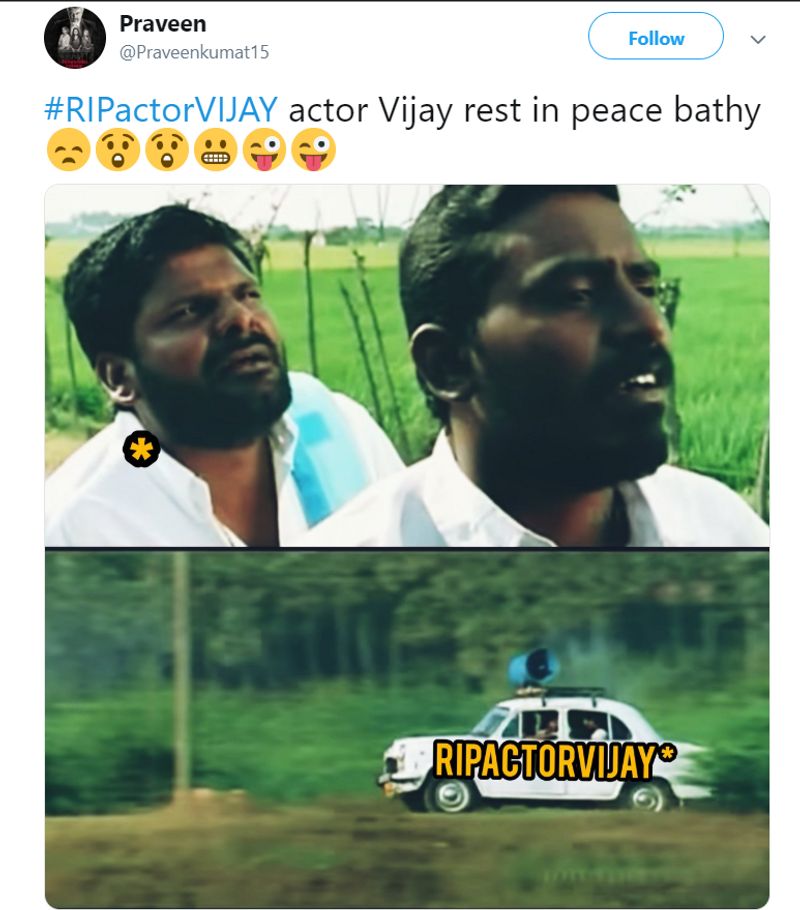 Chennai: One can never guess what changes the game of Twitter trends. In a recent case, out of the blue #RIPactorVijay began to trend despite the fact that Kollywood actor Vijay is hale and hearty.