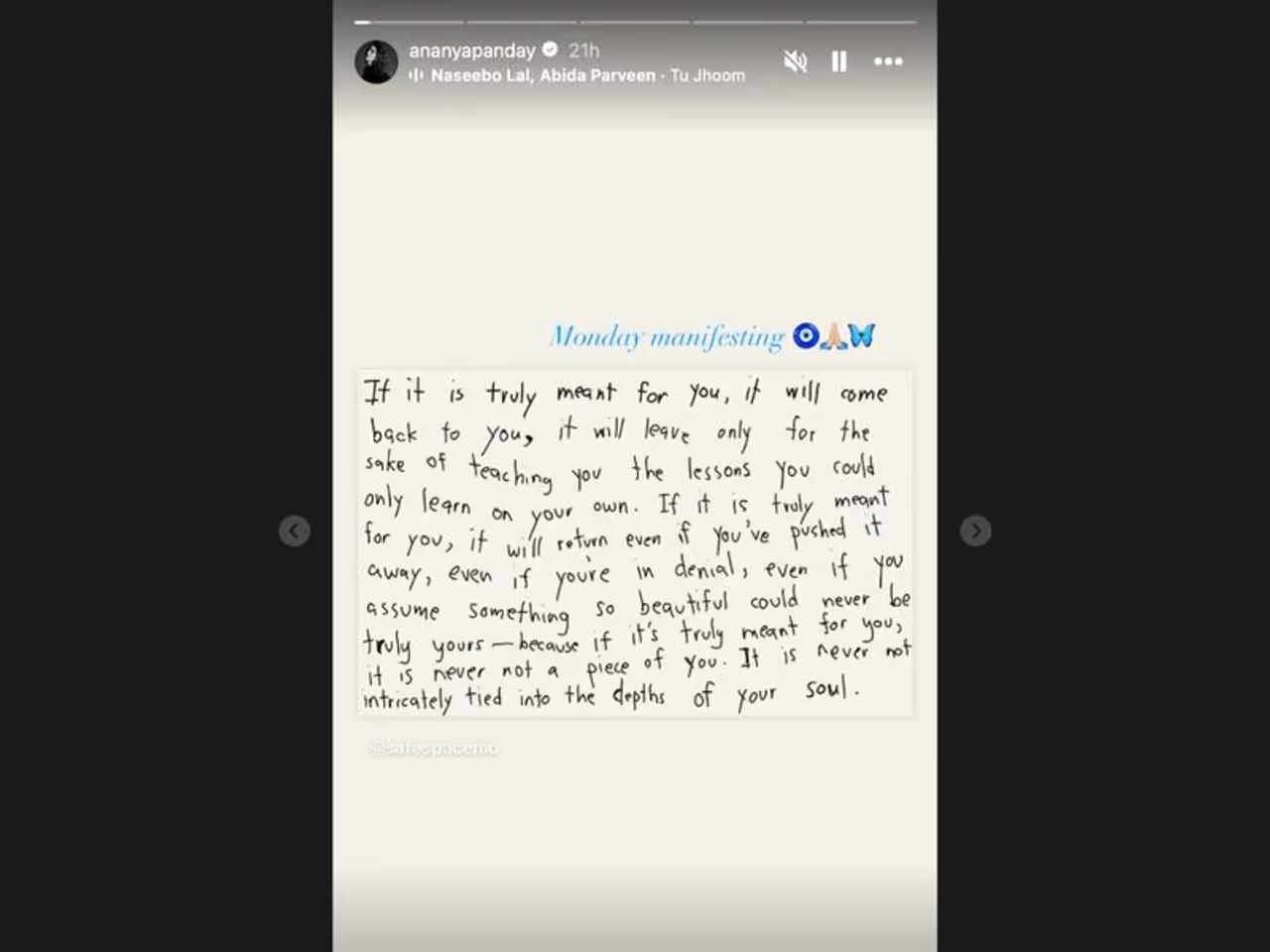 Taking to her Instagram handle on Monday, Ananya shared a thought-provoking quote that ignited a flurry of rumors regarding a possible breakup. The quote read, ‘If it is truly meant for you, it will come it will leave only for the back to your sake of teaching you the lessons you could only learn for you, On your own. If it is truly meant if you’ve pushed it in denial, even if you you’re in denial, so beautiful could never be it will return even away, even if you’re assume something truly yours – because if it’s truly meant for you, it is never not a piece of you. It is never not intricately tied into the depths of your soul.’ Alongside the quote, Ananya captioned her post with ‘Monday Manifesting’ along with emojis of gratitude, an evil eye, and a blue butterfly.