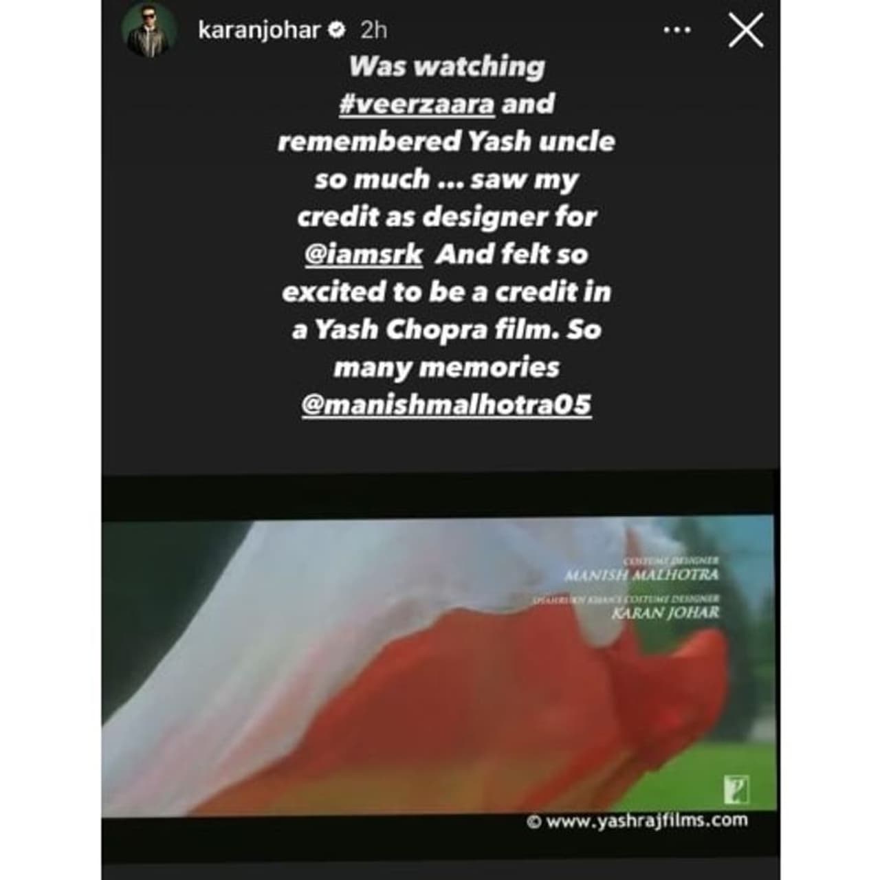 Reflecting on his involvement in 'Veer-Zaara', Johar took to his Instagram stories on April 11 to share his sentiments. He expressed his fond memories of Yash Chopra, the esteemed filmmaker, upon seeing his name alongside Chopra's in the credits. Johar's post featured a screenshot of the credits highlighting his role in designing Shah Rukh Khan's costumes, a moment that filled him with excitement and nostalgia.