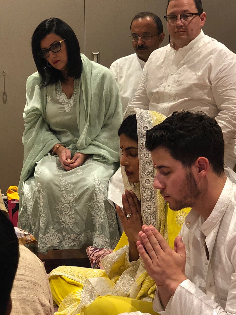 Priyanka is seen donning a yellow colour salwar kameez while fiance Nick is dressed in a white Kurta.