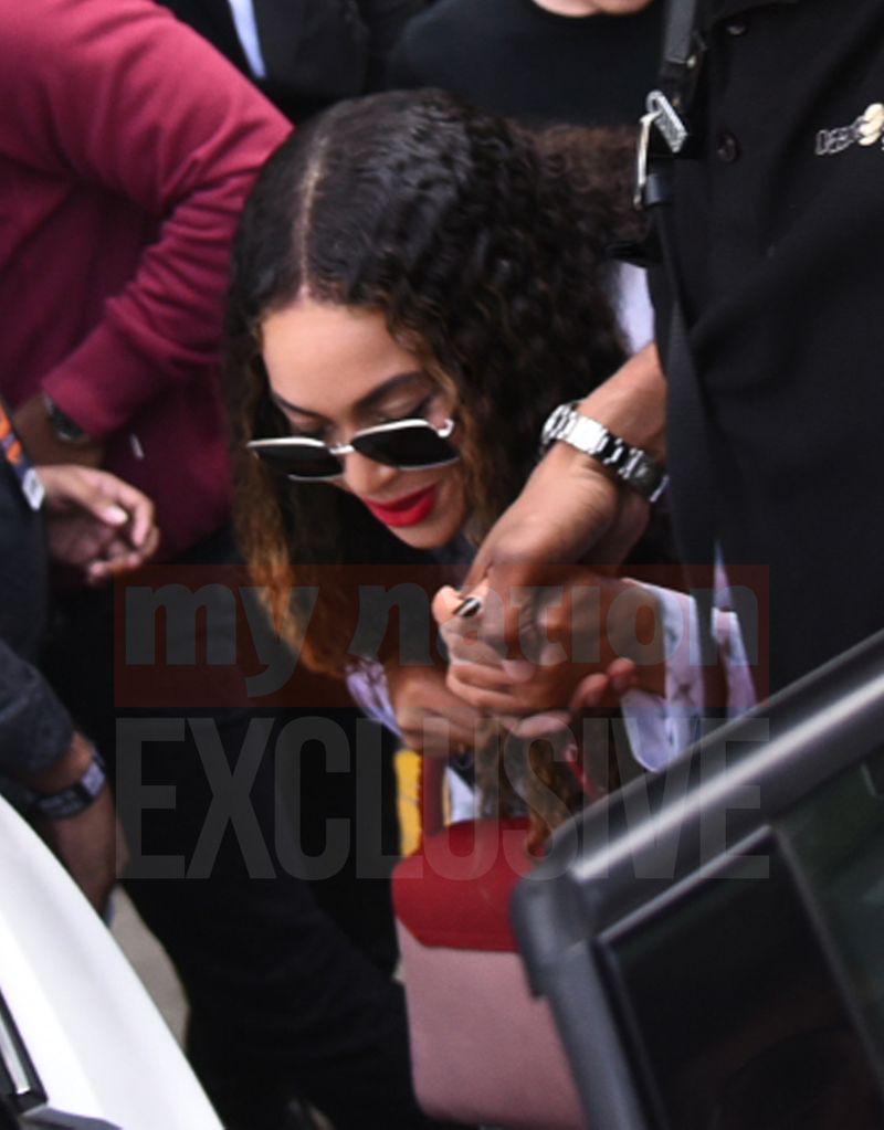 Meanwhile, we spotted her arriving in the city amidst heavy security rocking a long curly weave and a pink handbag.