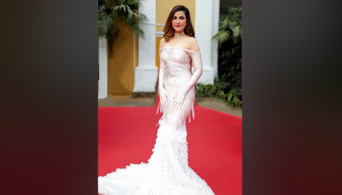 Ruchi graced the event in an off-shoulder, crystal-embellished gown that perfectly accentuated her silhouette. Feathered detailing along the hemline created a fluid movement with every step, while the soft shimmer of the fabric added a touch of ethereal glamour. A statement choker, adorned with delicate butterfly motifs, added poetic sophistication, completing a look that balanced style with subtle refinement.