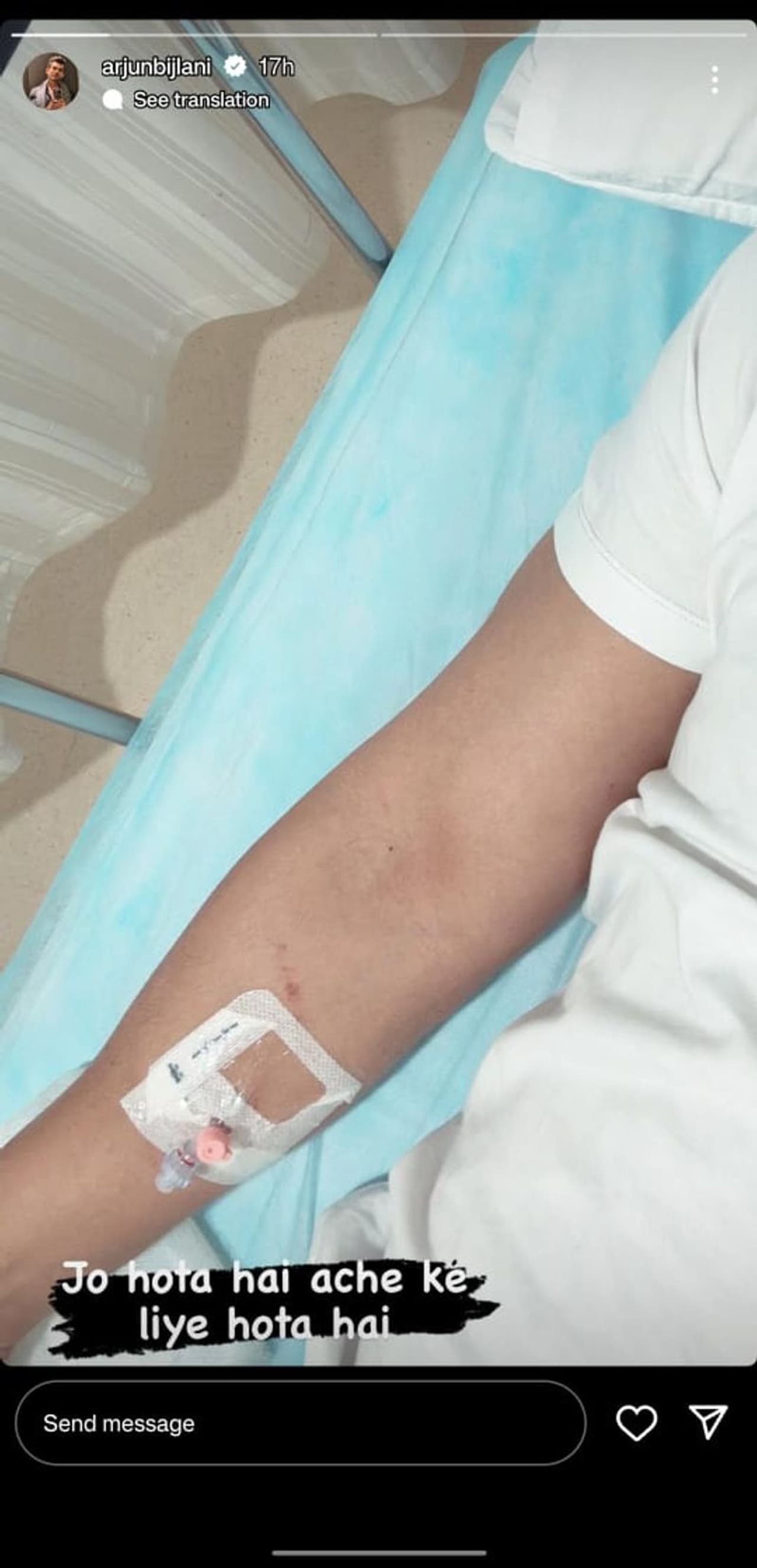 The actor also shared a glimpse of his hospital bed on his Instagram Stories, showing his injected hand with the caption, 'Jo hota hai ache ke liye hota hai.'