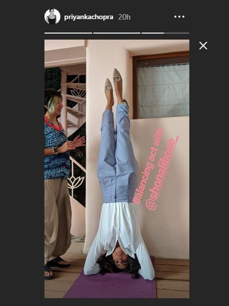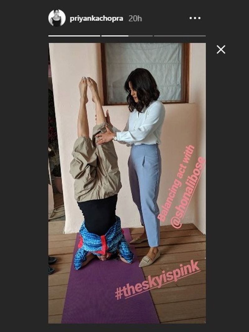 The former Miss World had been shooting for her upcoming Bollywood film The Sky Is Pink in the Capital and had to wrap it by Sunday ahead of the wedding. But, she still managed to sneak in a little yoga tutorial for the film's director Shonali Bose.