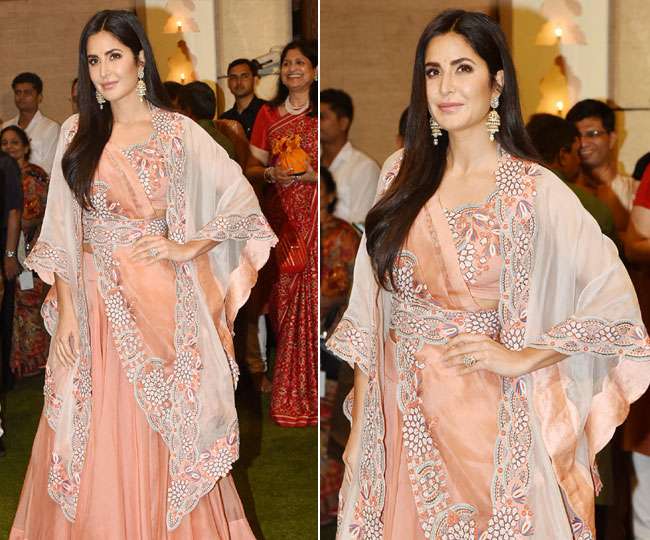 Katrina Kaif hit in an embroidered, peach Anamika Khanna concept saree during the festival celebration. A sheer embroidered cape completed Katrina’s outfit. The actor wore jhumkas and left her hair open.