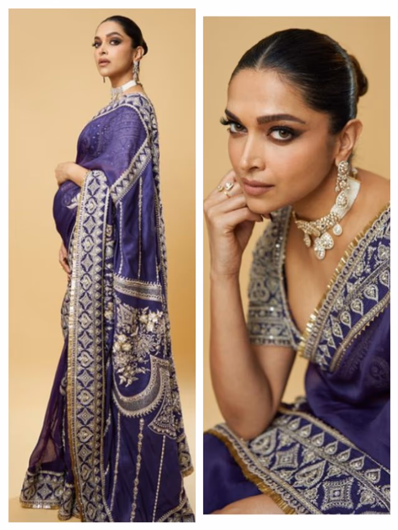 Mom-to-be Deepika Padukone paired the elegant saree with a matching blouse and rocked a kohl-rimmed smokey eye look, dark nude lipstick, and glowing makeup.